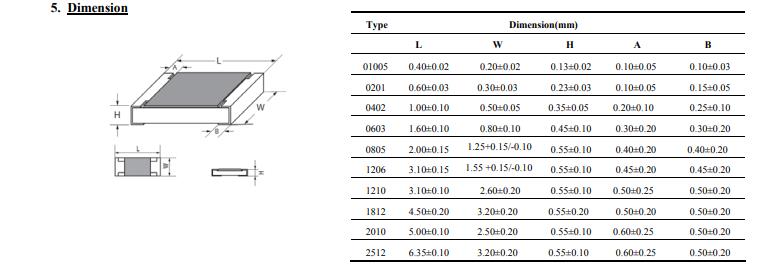 尺寸:01005、0201、0402、0603、0805、1206、1210、2010、1812、2512